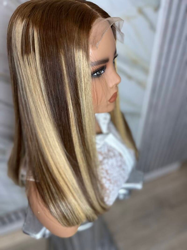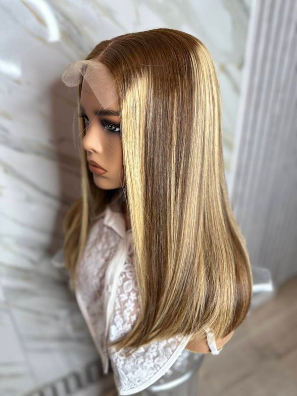 14” Vietnamese Silky bone straight blonde with Brown Lowlights